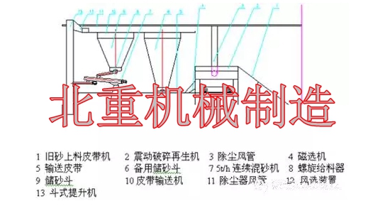 人工落砂后,舊砂通過上料皮帶機(jī)進(jìn)入振動落砂機(jī)完成落砂、破碎、篩分,再生,經(jīng)過帶由磁選的輸送皮帶進(jìn)入斗式提升機(jī),在輸送過程中人工加入新砂。在斗提的出口處安裝風(fēng)選裝置,經(jīng)過風(fēng)選的型砂經(jīng)皮帶輸送機(jī)進(jìn)入儲砂斗。劃線平臺鑄件生產(chǎn)時,型砂從砂斗經(jīng)螺旋給料器進(jìn)入混砂機(jī)。
